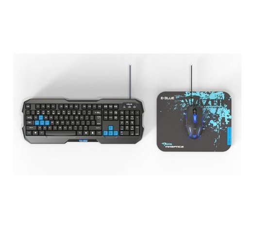 E-BLUE Sada klávesnica Polygon, herná, čierno-modrá, drôtová (USB), US, s myškou Cobra II, a podložkou Mazer Marface S